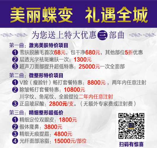 2.除皱畅打套餐特惠:10800元川字纹、鱼尾纹、全脸提拉二年内任意注射。
