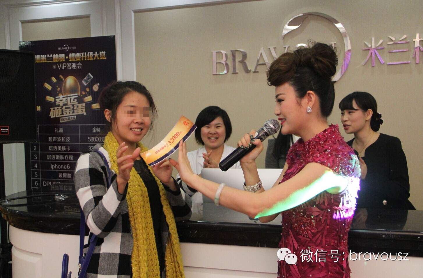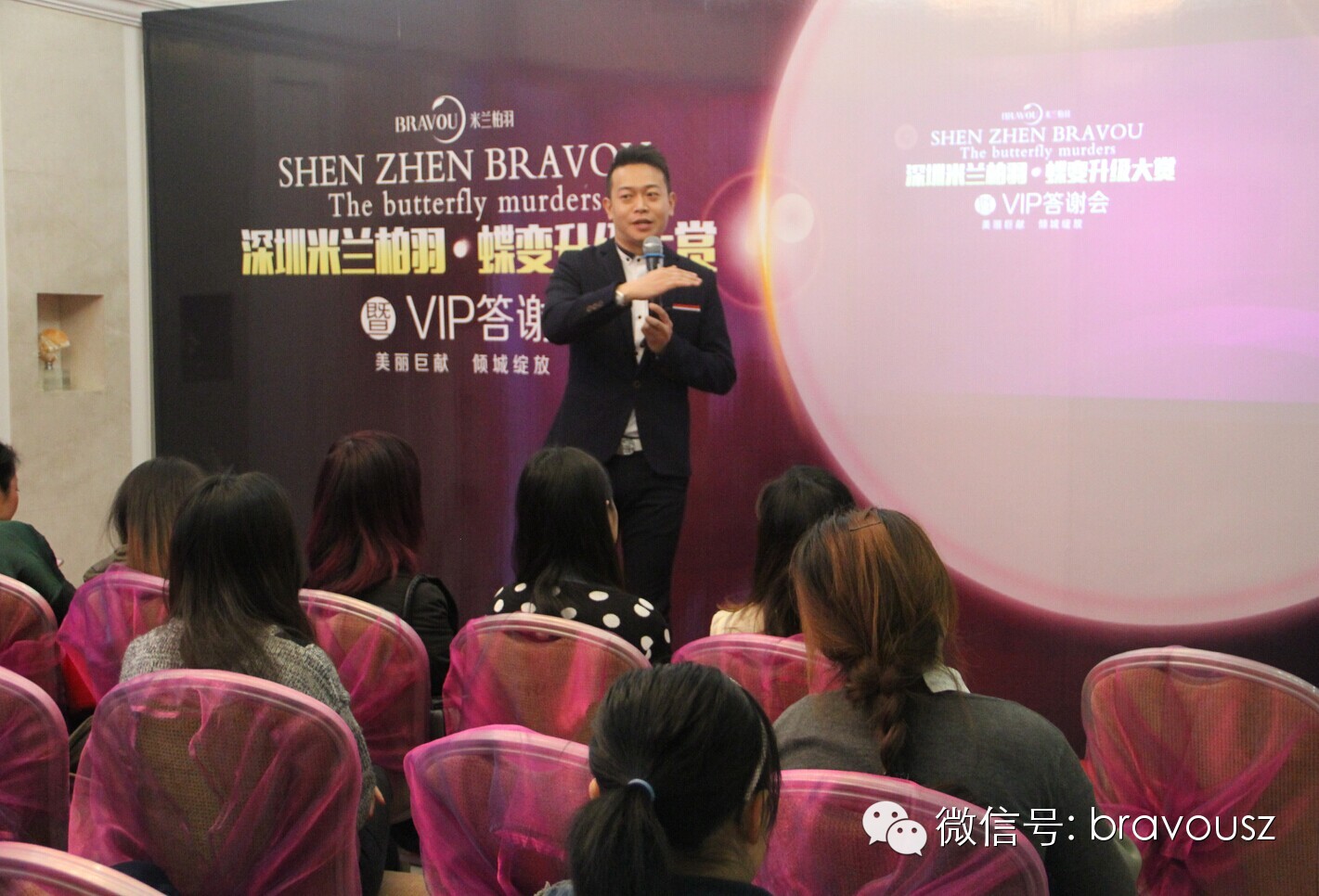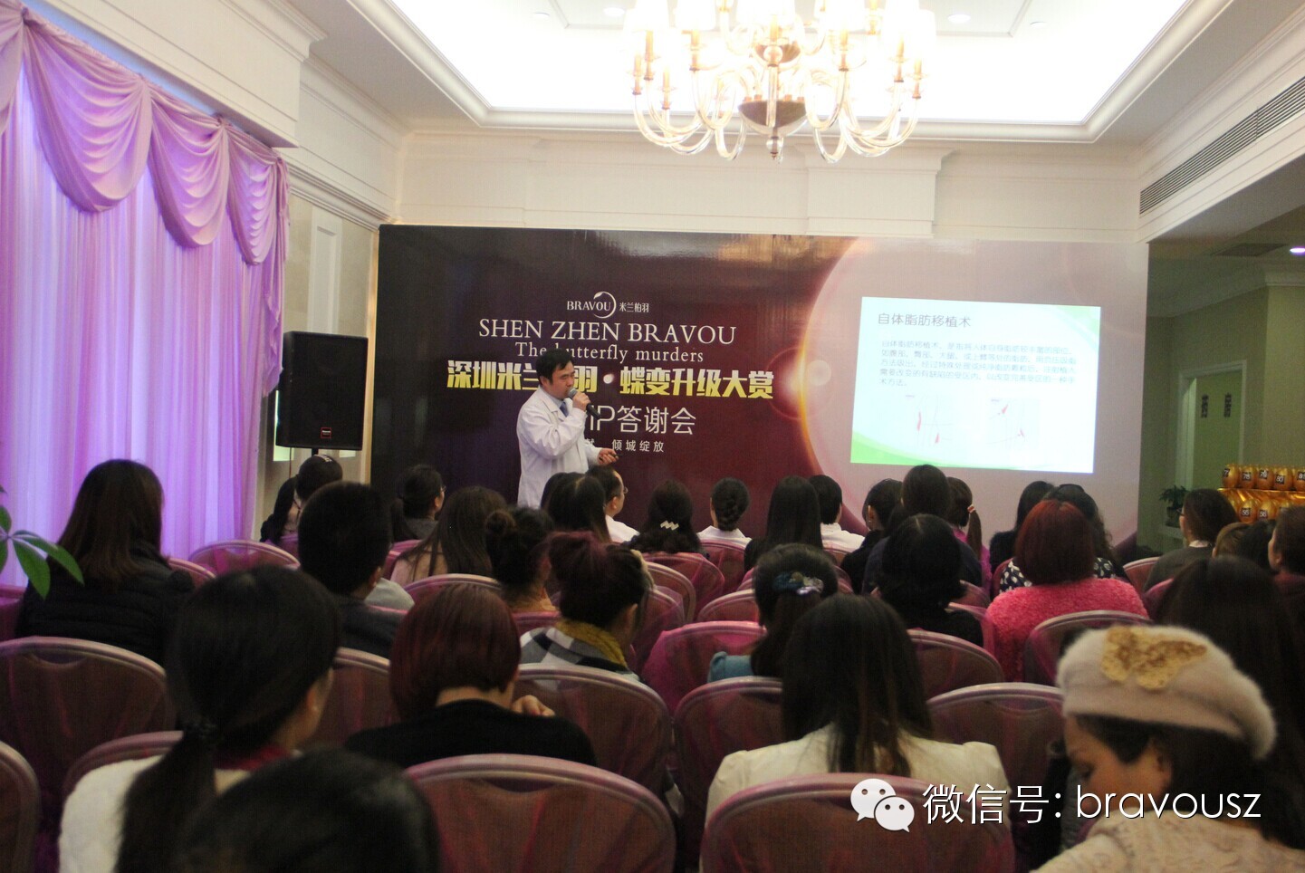 2014年12月13日,深圳米兰柏羽蝶变升级大赏暨VIP答谢会如期进行,答谢会当天,时尚名媛,商贾名流,模特达人,以及众多想变美的爱美者纷纷来到米兰柏羽,与院士级整形专家O距离交流。环球品牌小姐模特大赛形象设计总监李帅民亲授美丽秘诀,蝶变真人秀现场展现震撼对比,音乐,美女,灯光,舞台,茶点,佳肴,气氛非常火爆,大奖停不下来。